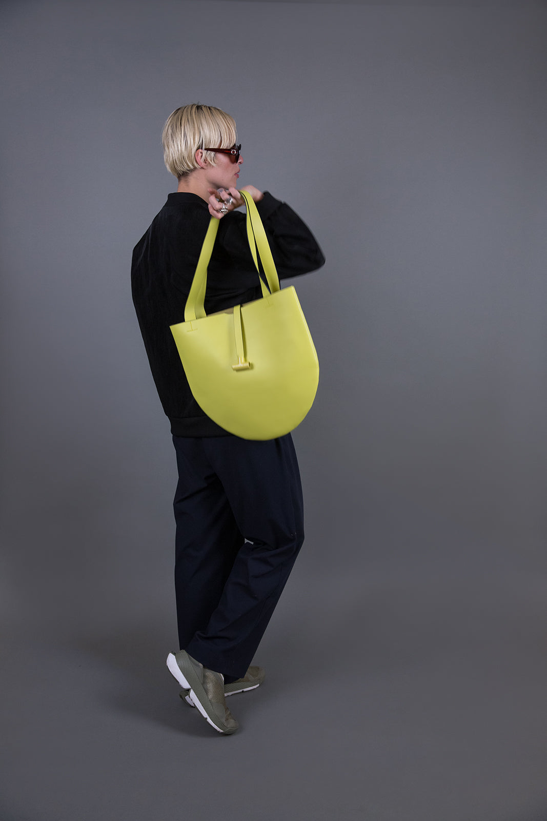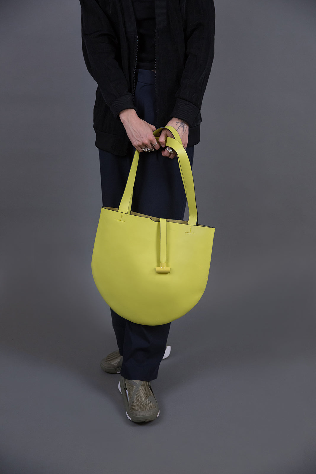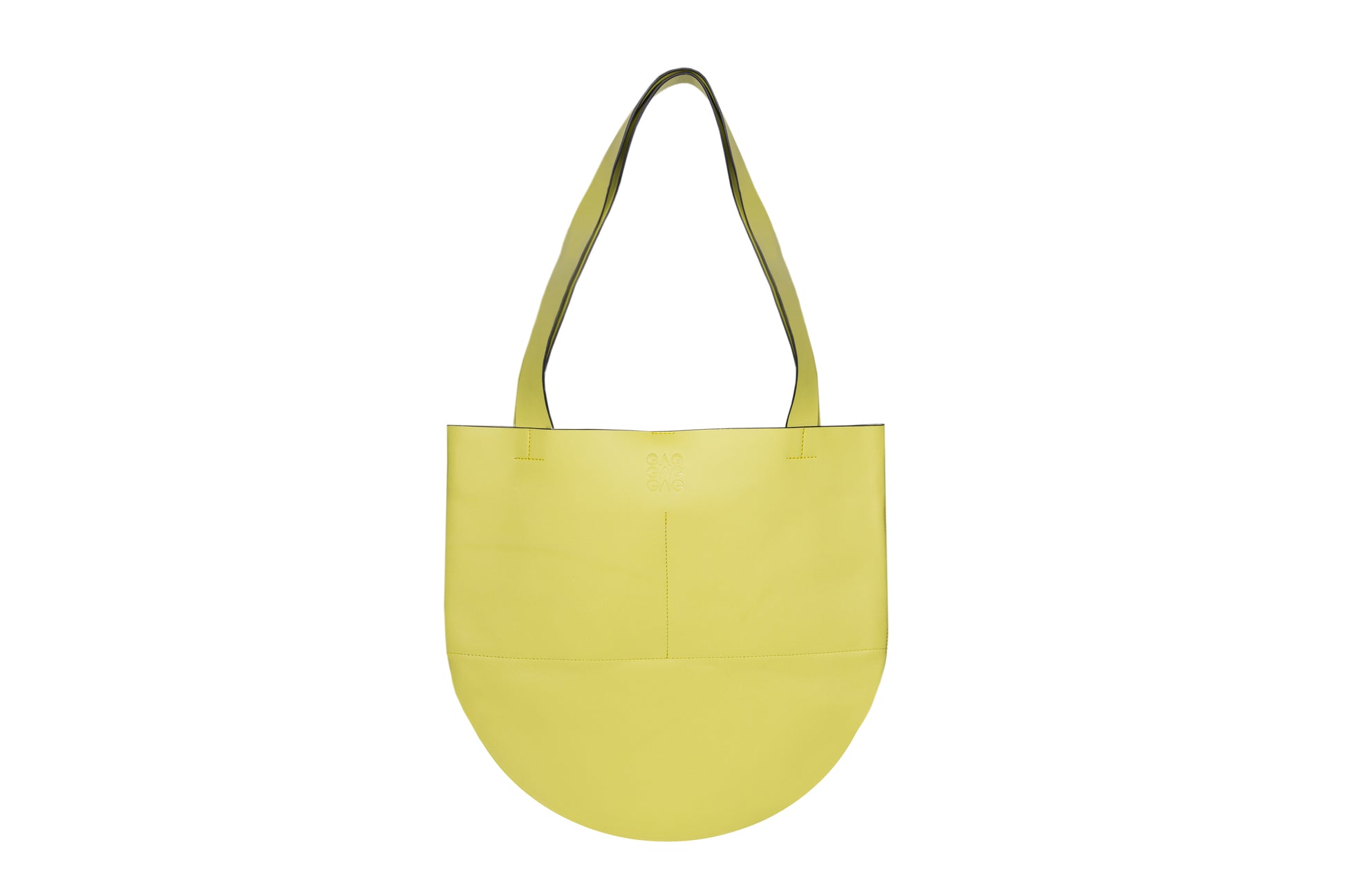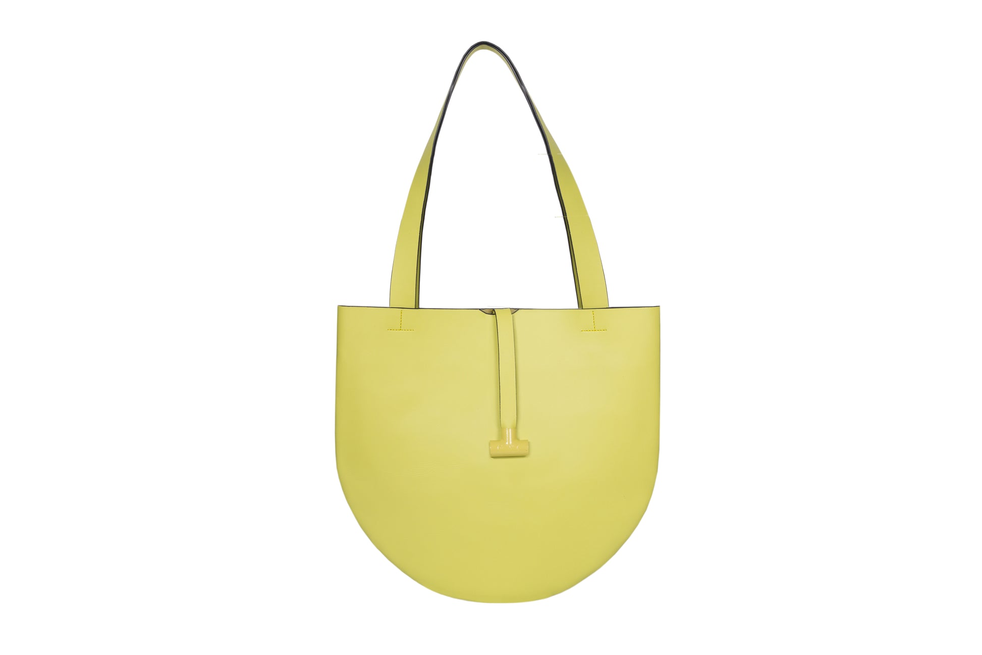 Round leather bag with internal compartments for small items.