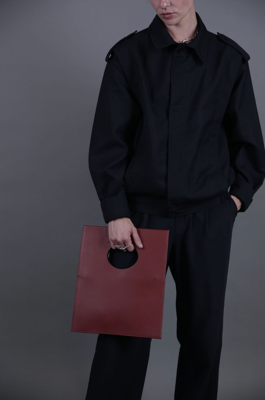 Square handbag with internal zipper.