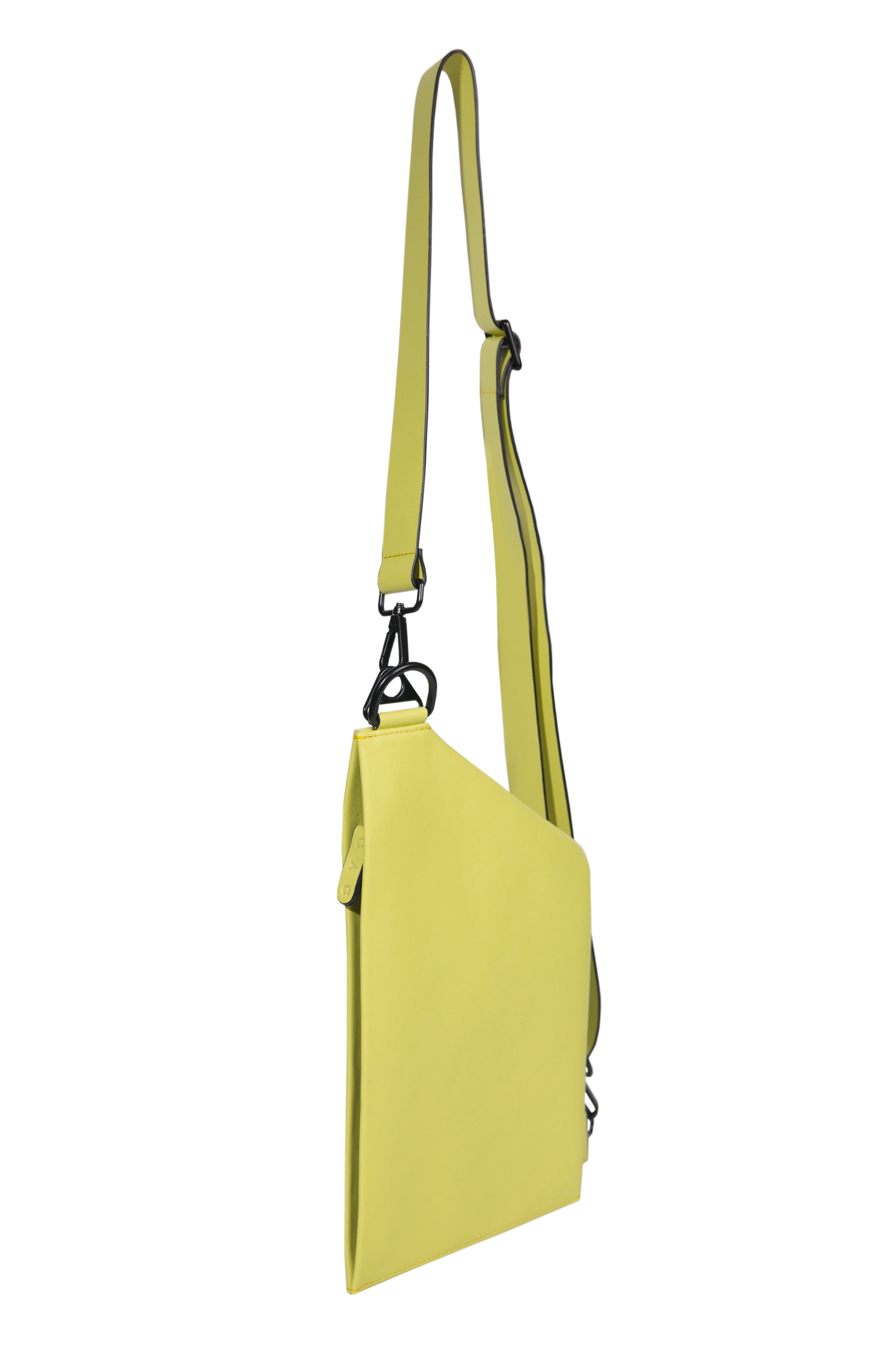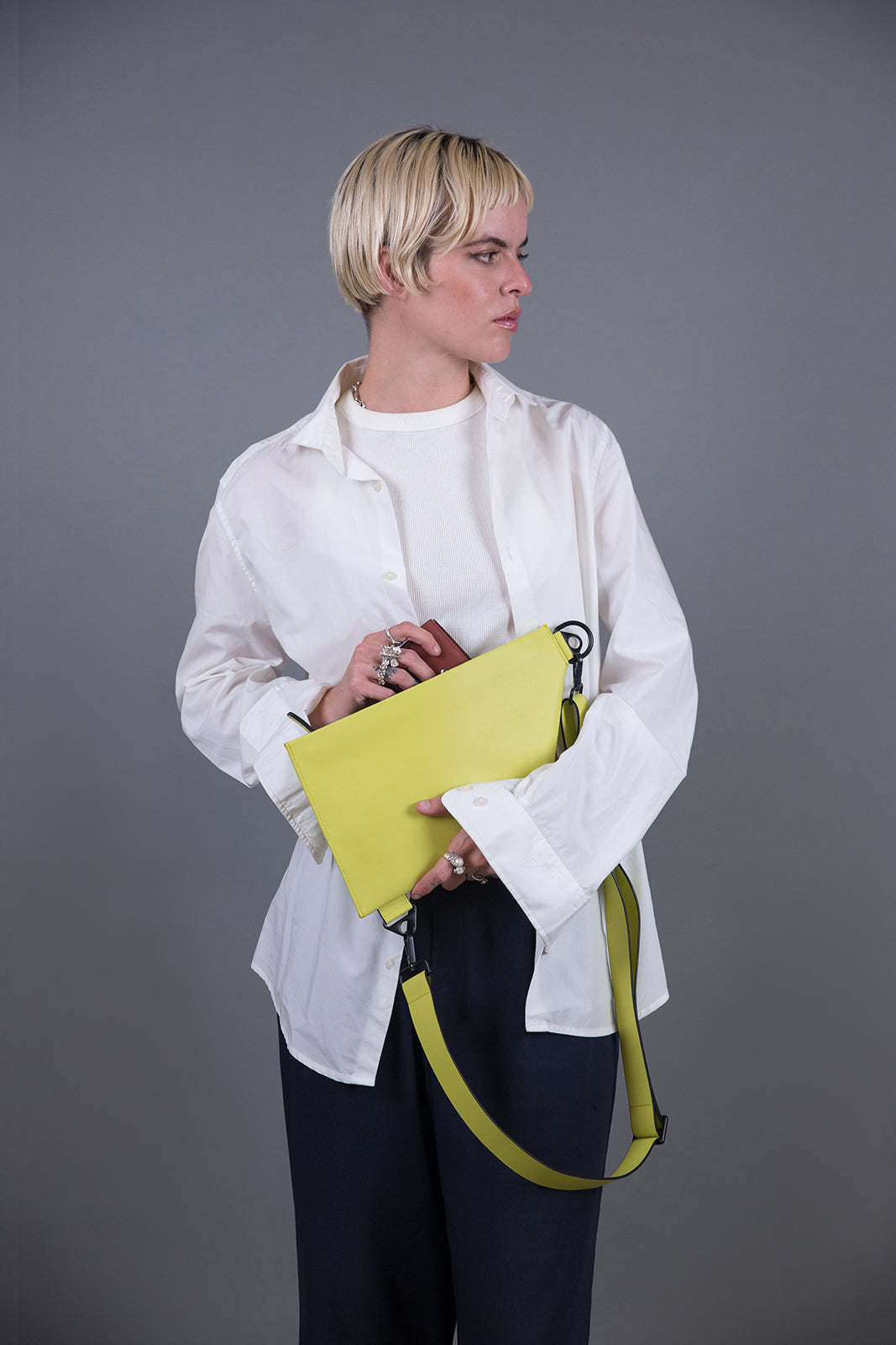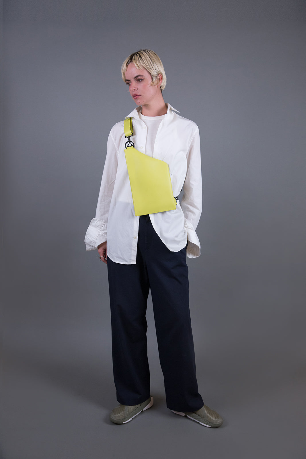 Rectangular leather sling bag. Adjustable strap for cross-shoulder wear.