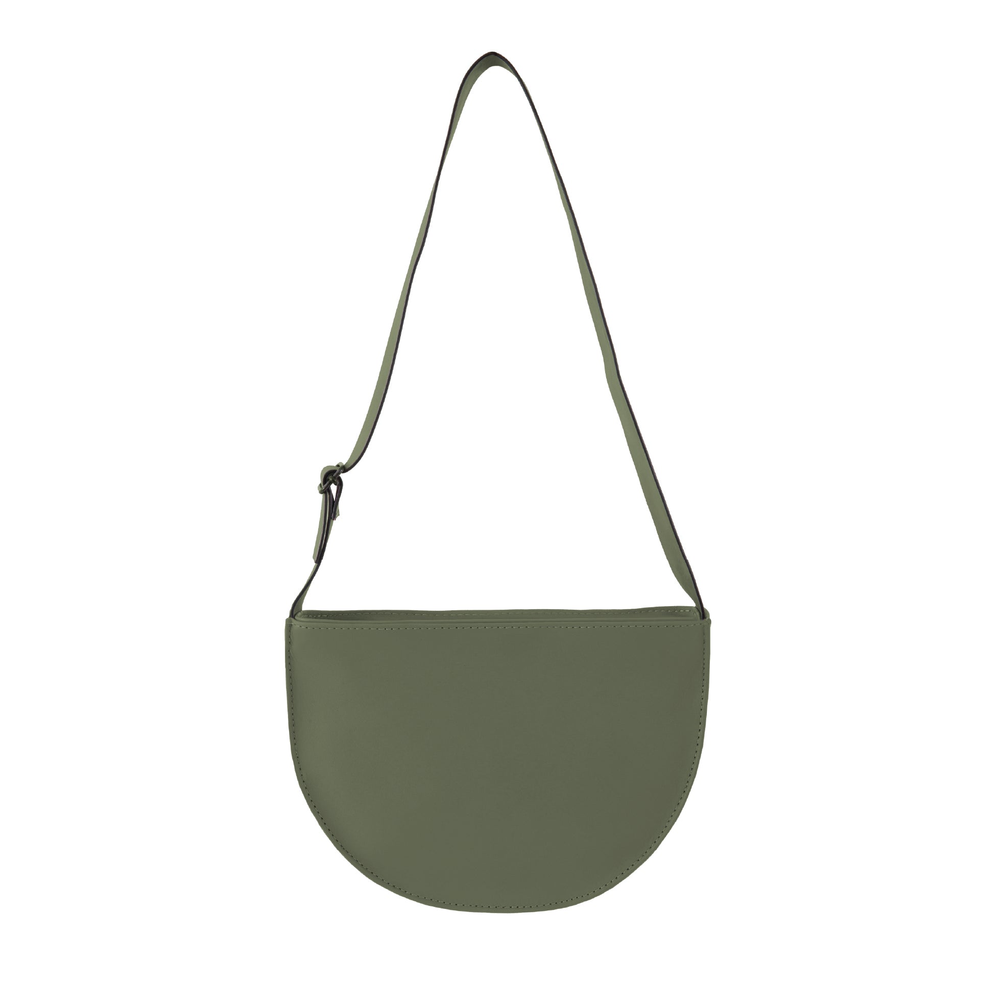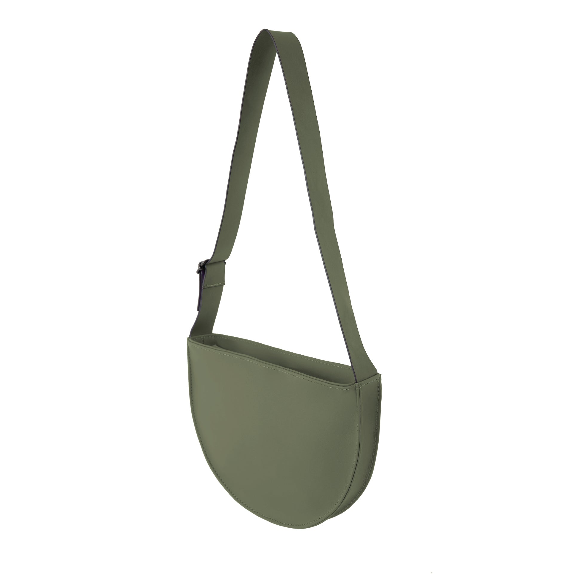 Half-circle leather bag with adjustable strap.