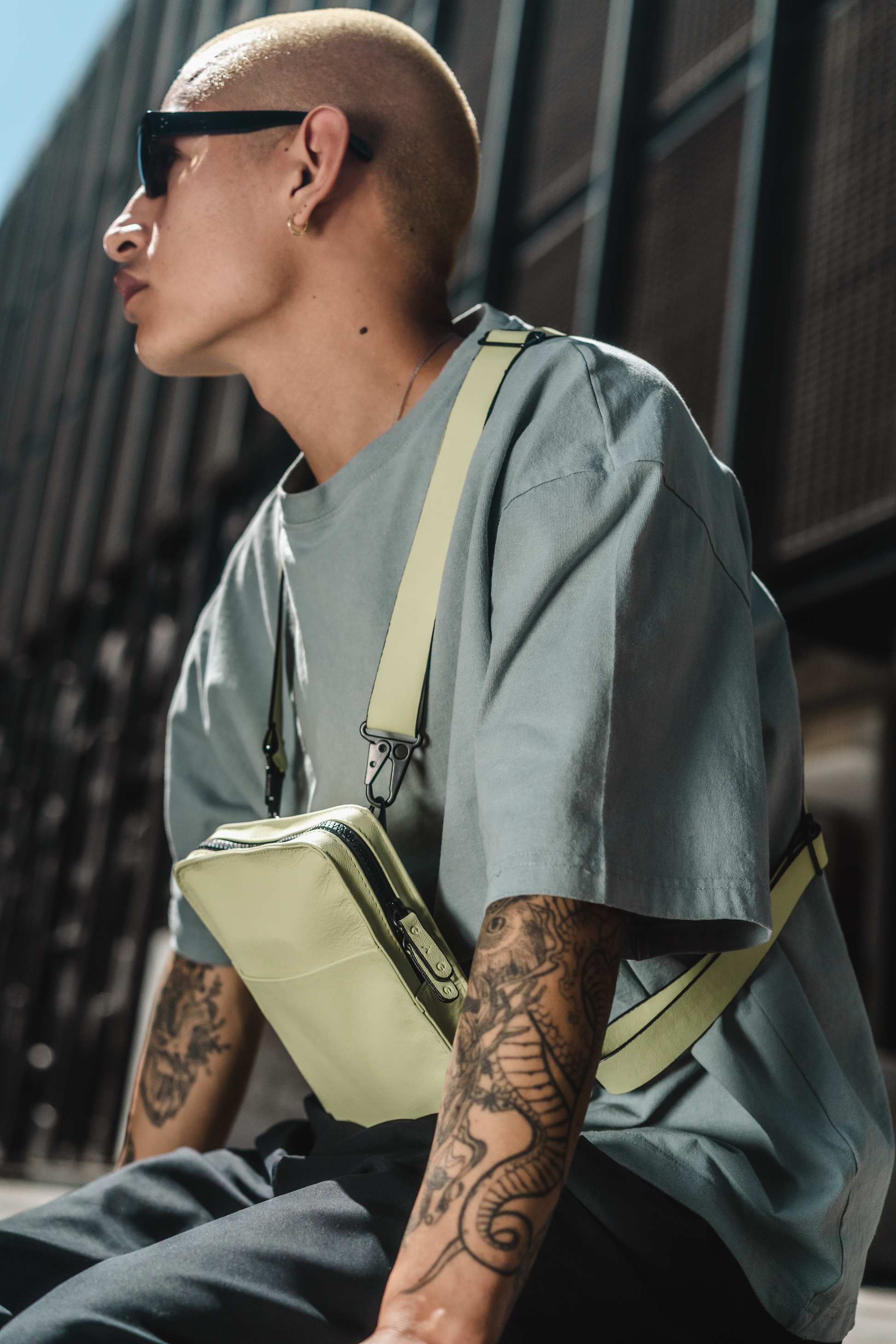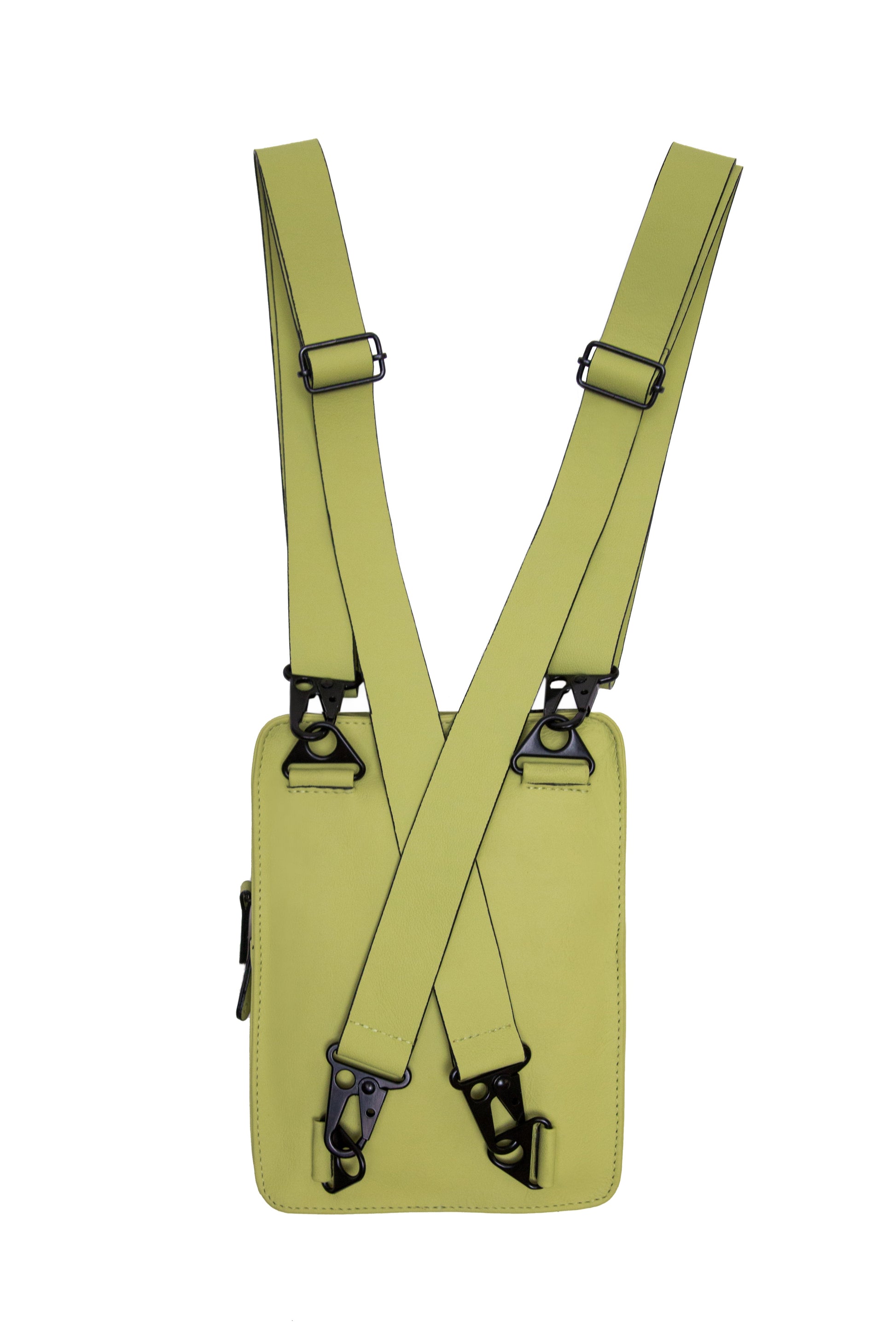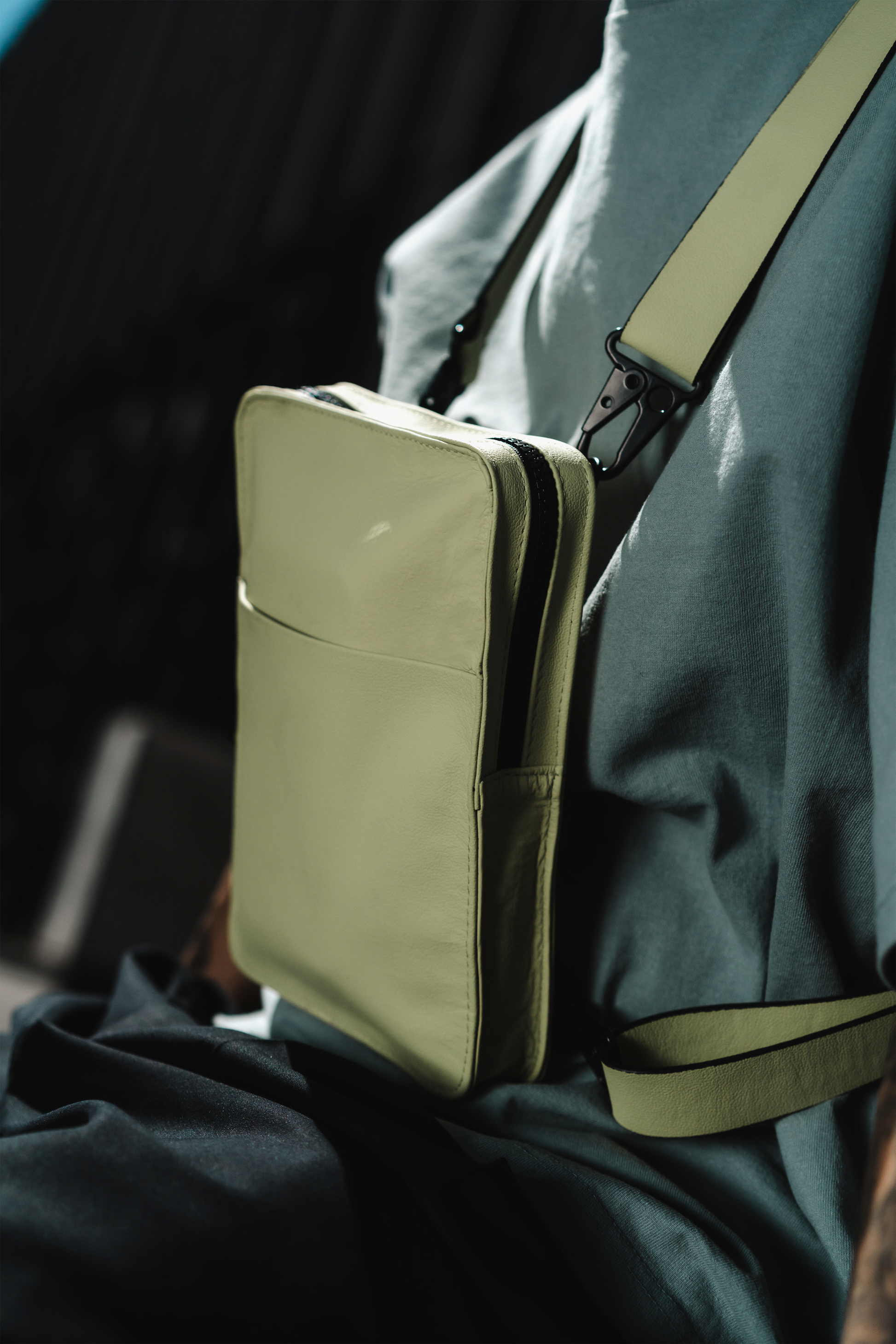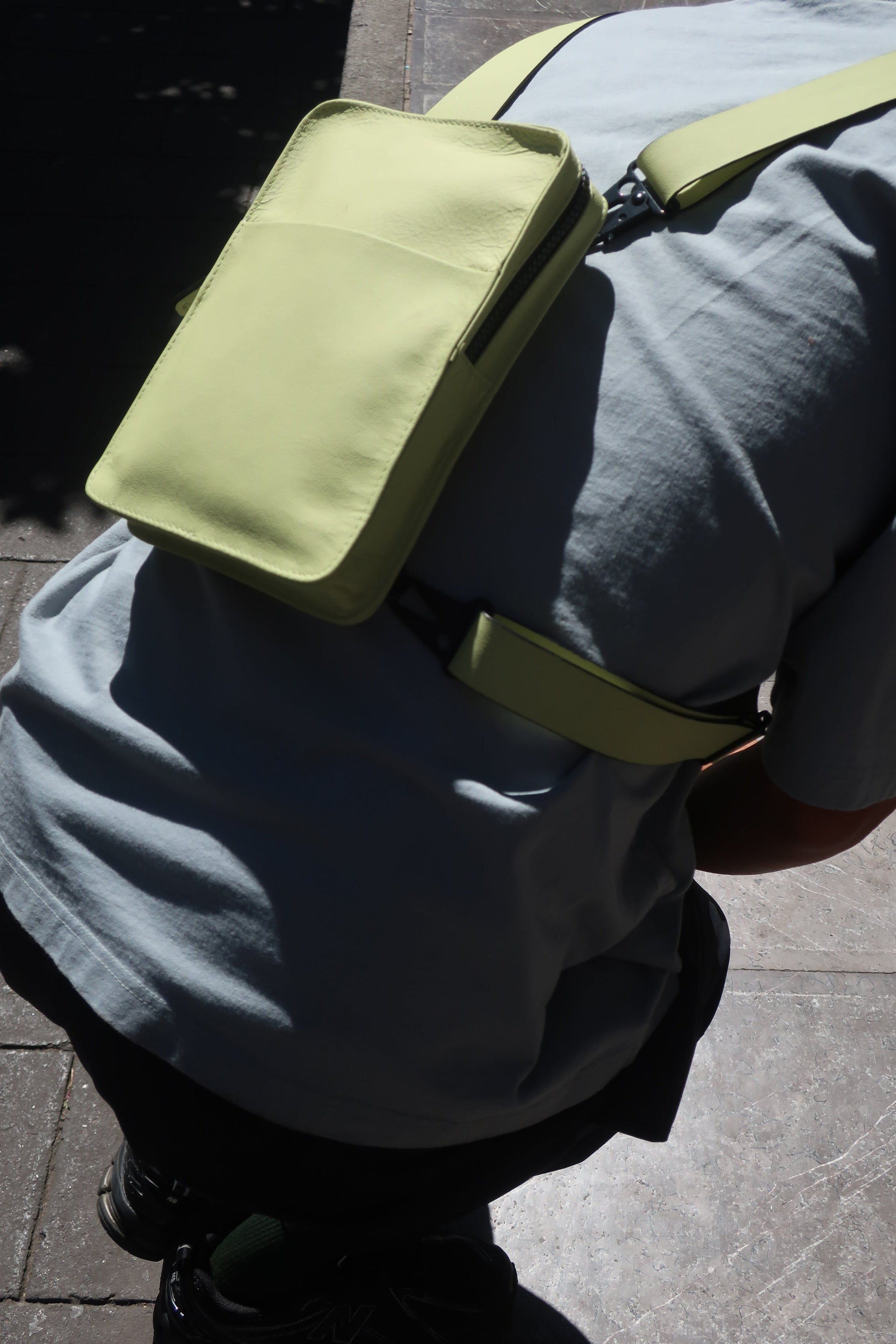 Cangurera rectangular de cuero, cuerpo con zipper y bolsa al frente tipo canguro. Las correas ajustables de forma independiente permiten convertirla en una mochila.