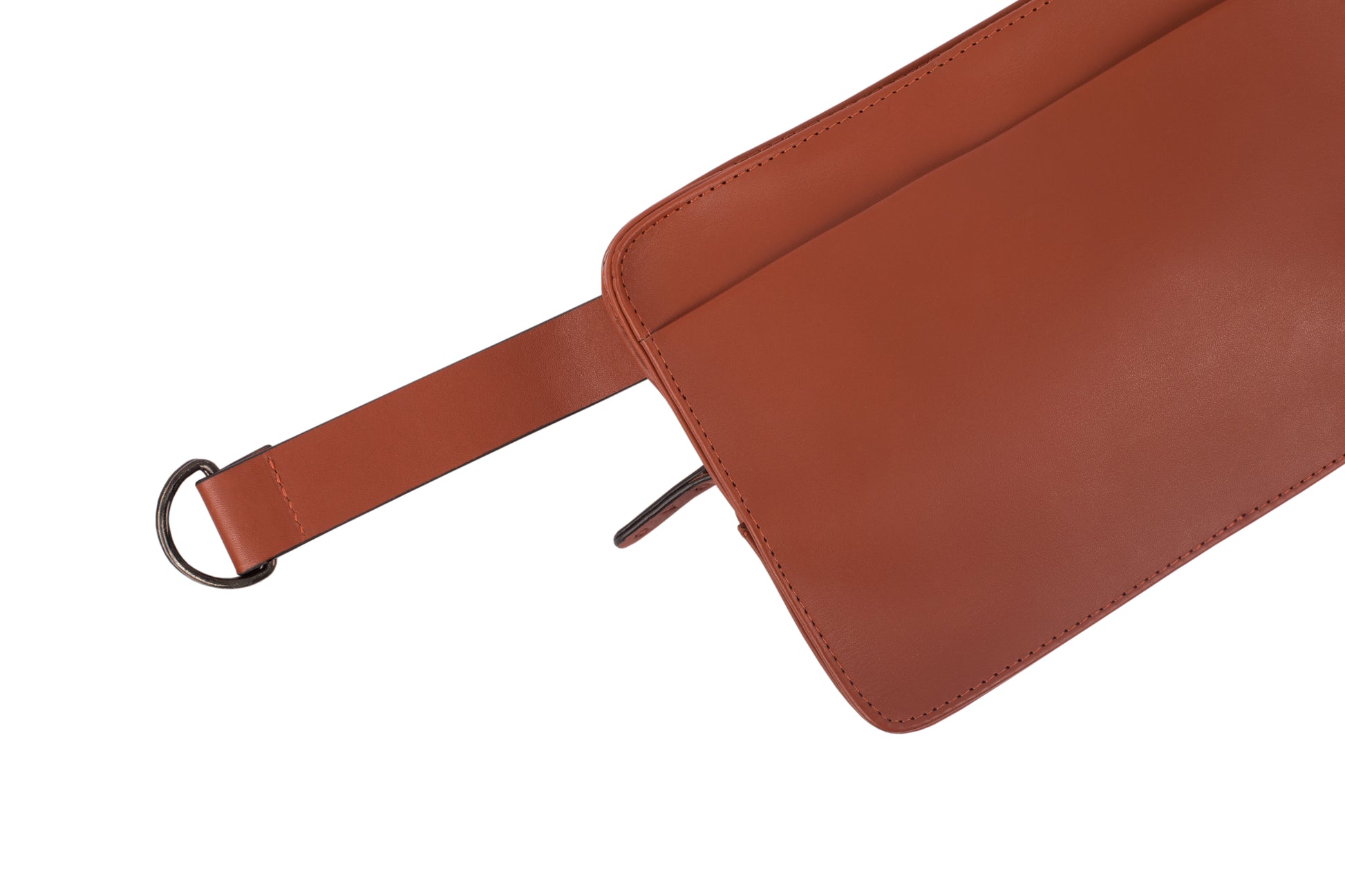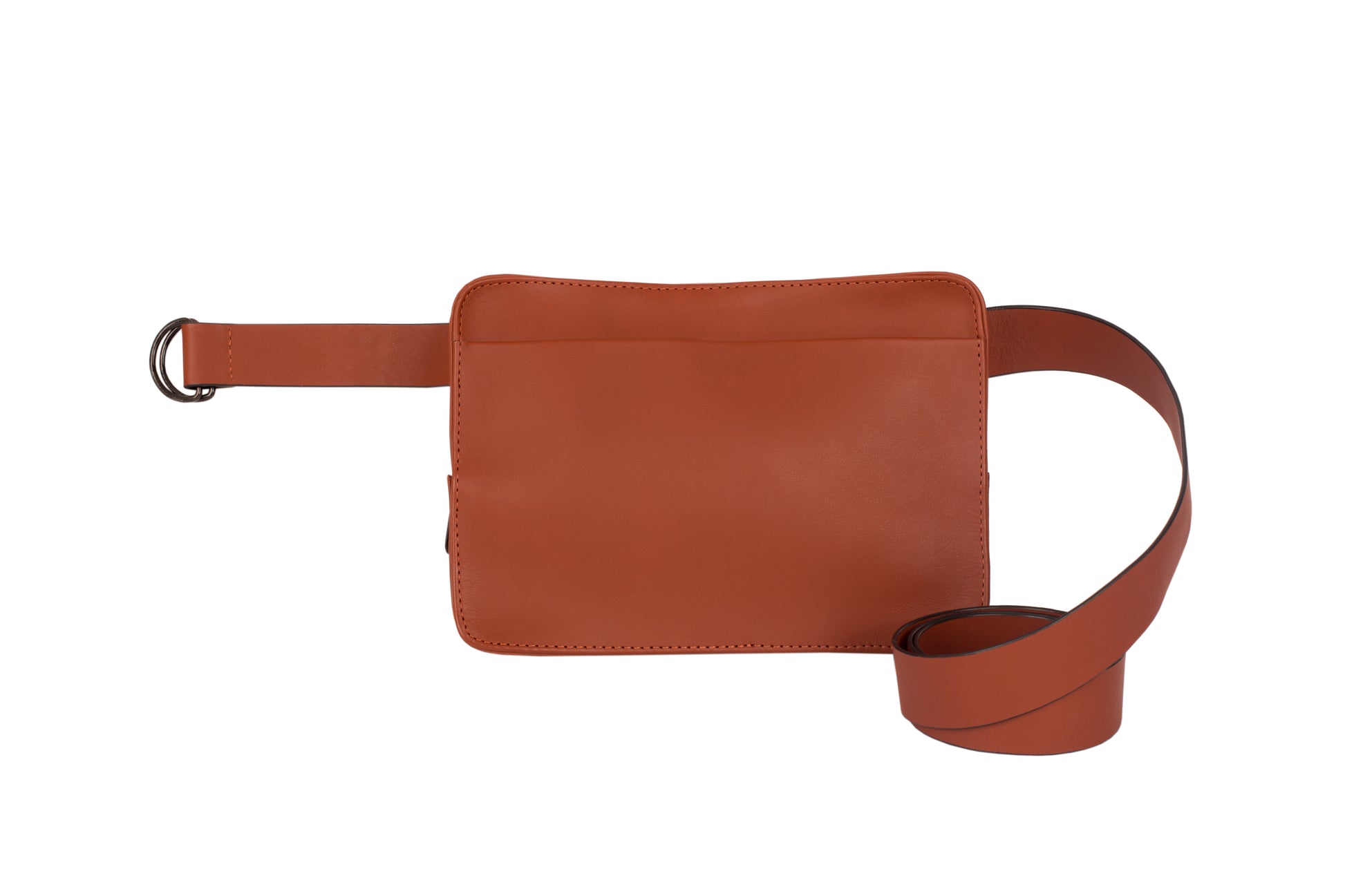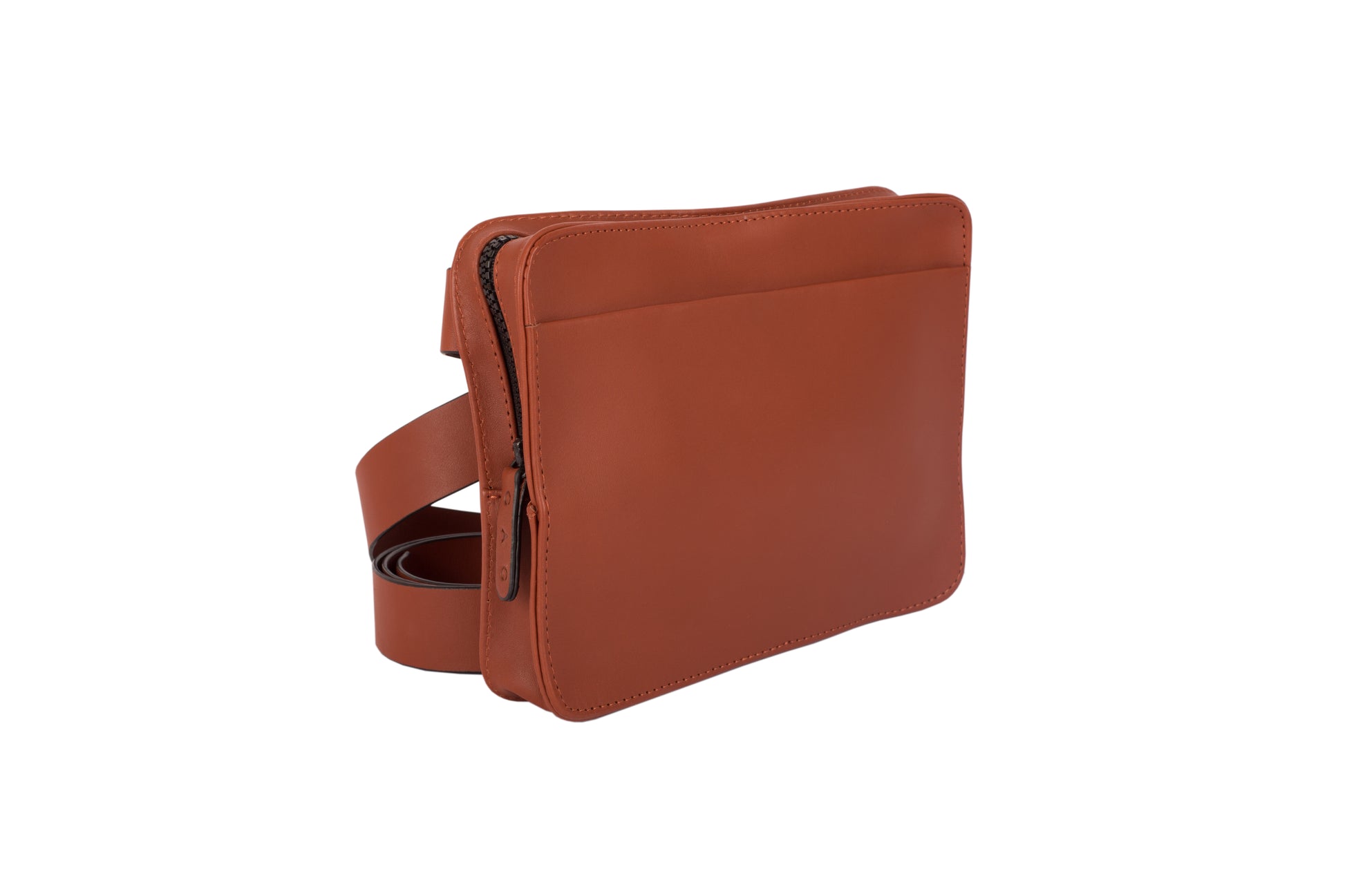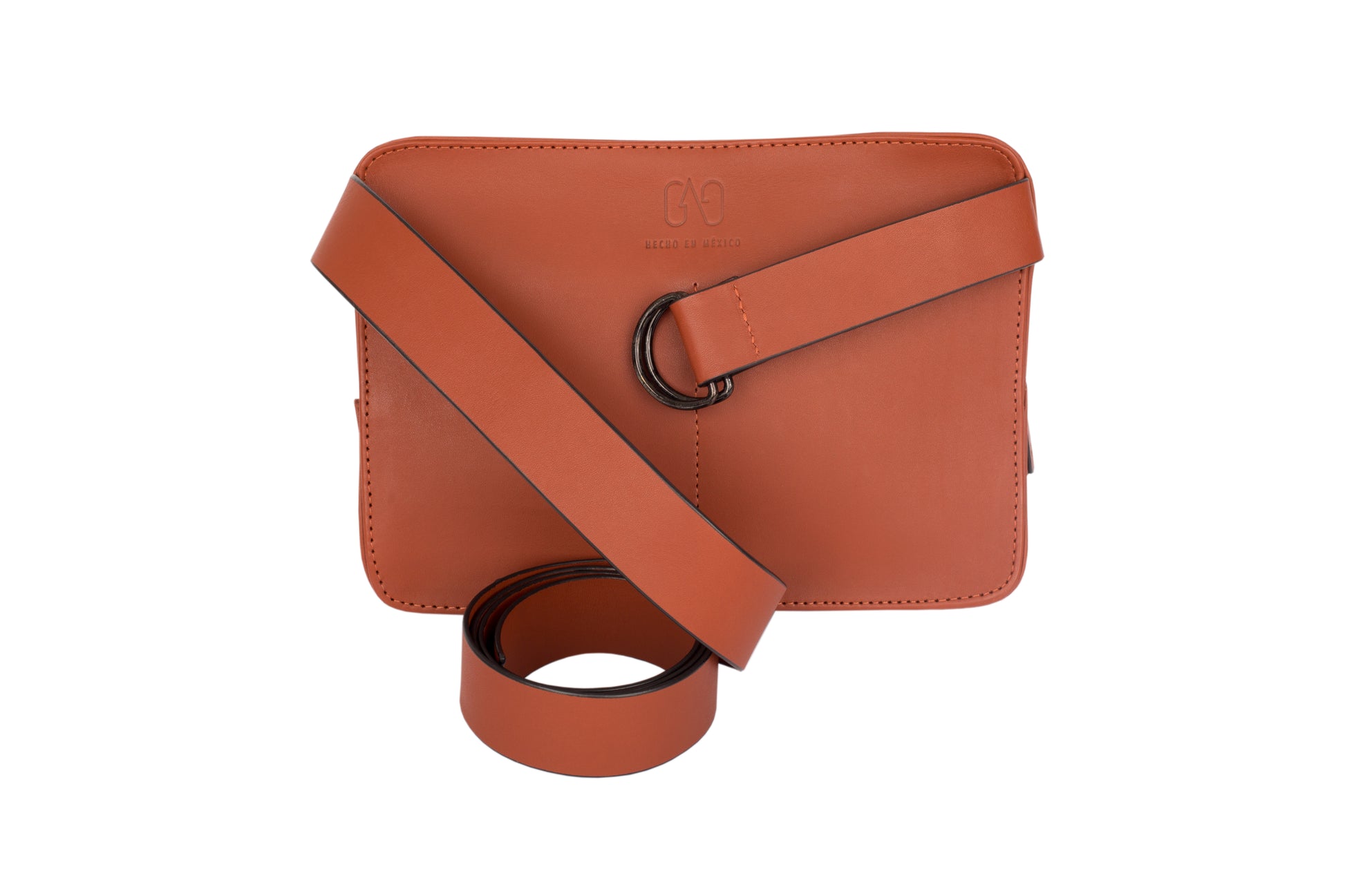 Cangurera rectangular de cuero, cuerpo con zipper y bolsa al frente tipo canguro. Tirante ajustable para usar al hombro, cintura o cruzado.