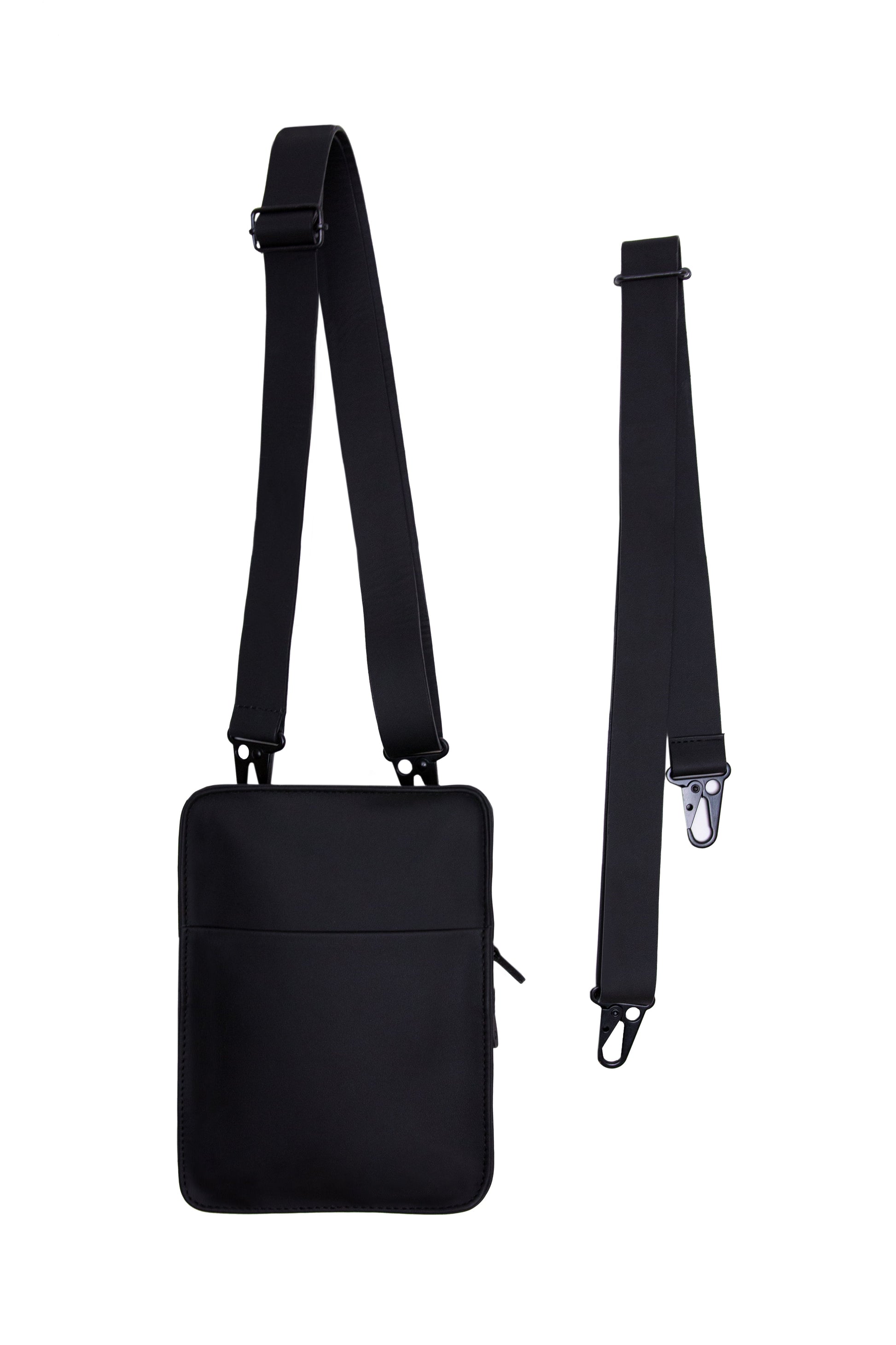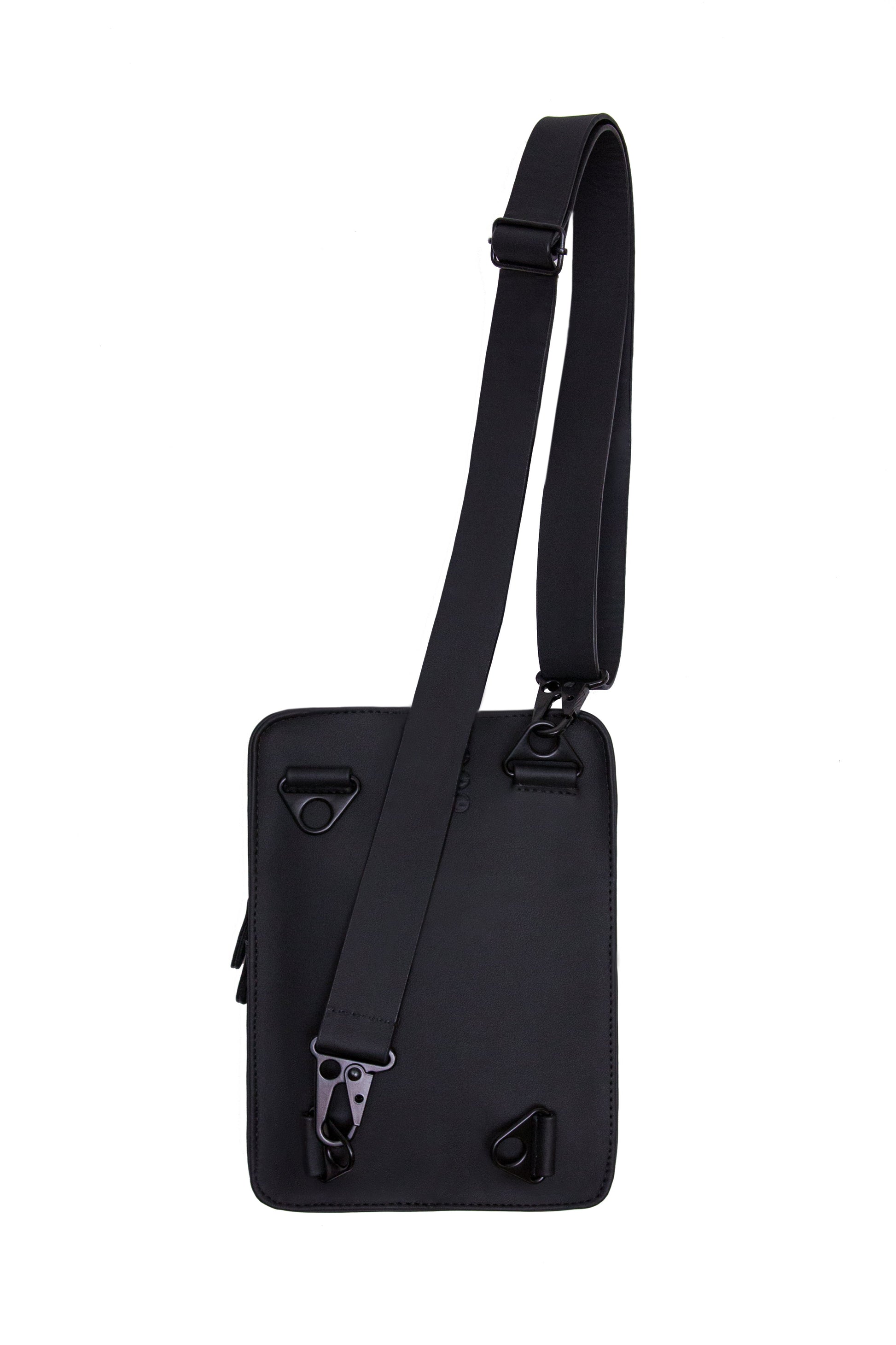 Cangurera rectangular de cuero, cuerpo con zipper y bolsa al frente tipo canguro. Las correas ajustables de forma independiente permiten convertirla en una mochila.