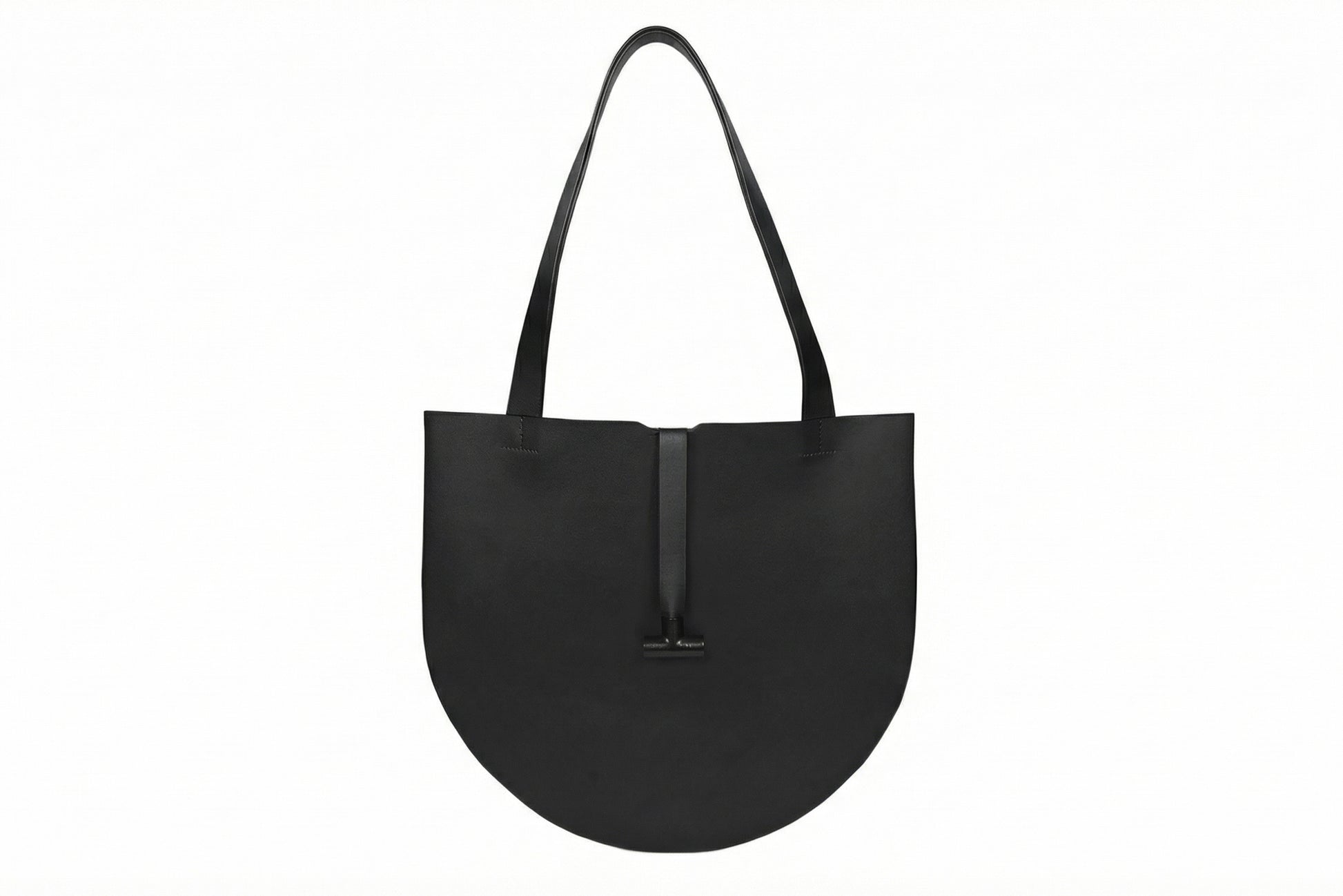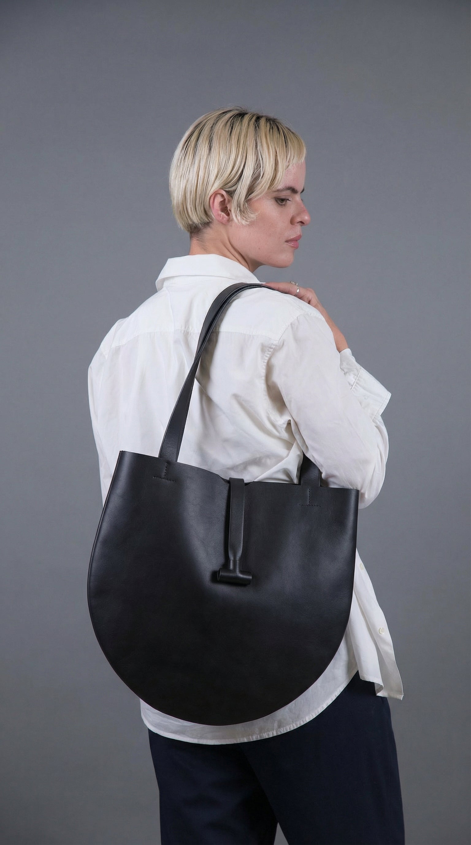 Bolsa redonda en cuero certificado con compartimentos internos para objetos pequeños.